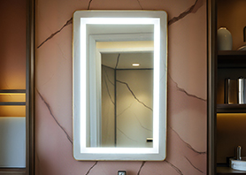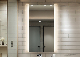 The Lucy backlit mirror is the perfect balance for ambient lighting and softness.