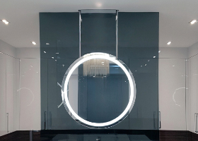 The Alpha backlit mirror is a ceiling mounted backlit mirror that floats in any modern space.
